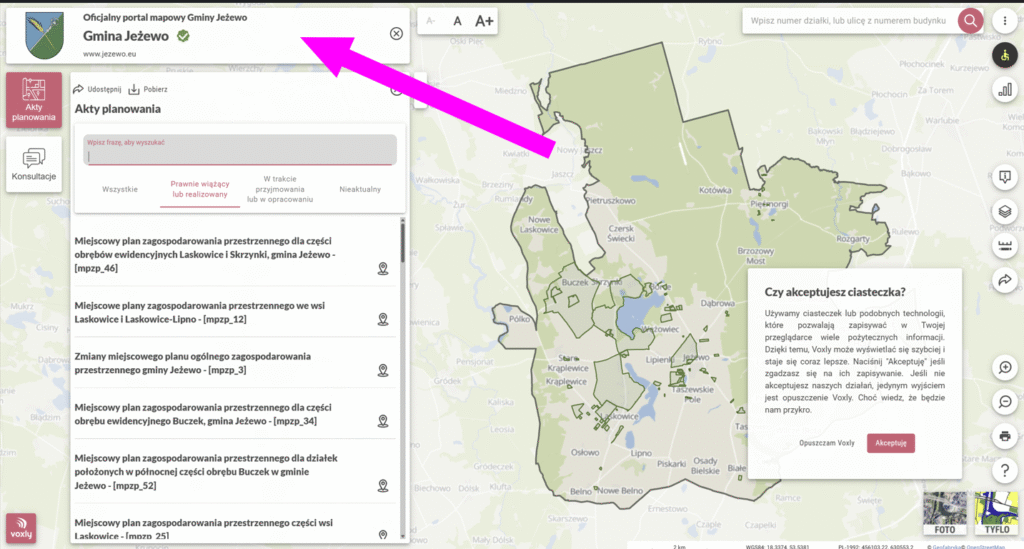 Jeśli jesteś w organizacji i tak jak wspomnieliśmy przed chwilą, widzisz jej nazwę, numer działki lub adres możesz znaleźć przez wyszukiwarkę w oknie mapy organizacji.