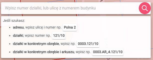 - Przełączać się pomiędzy widokiem działek i widokiem adresów,