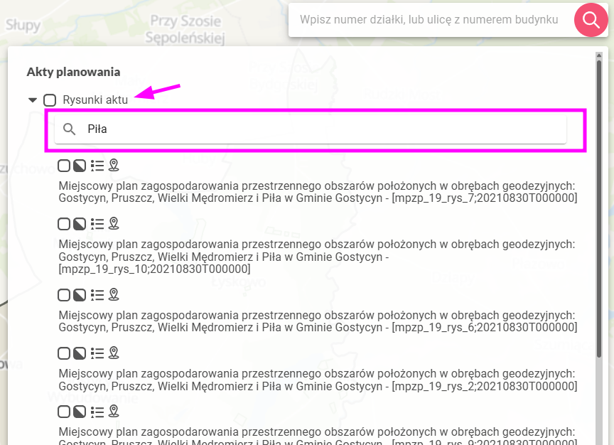 Rysunki aktów planowania to często duży zbiór danych. Aby łatwiej było włączać i zarządzać poszczególnymi rysunkami, wykorzystaj filtr nad listą rysunków. Możesz filtrować, wpisując ciąg znaków z tytułu lub identyfikatora.