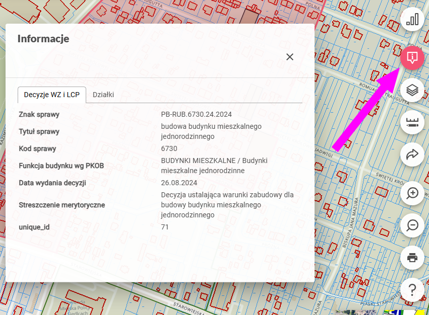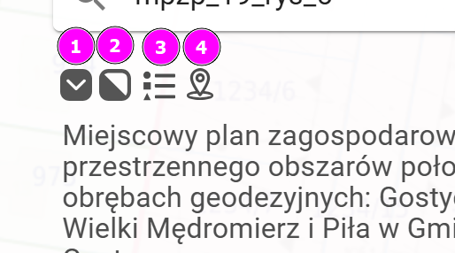 Na mapie pojawią się właściwe dla danego tematu obiekty. Mogą to być granice aktów planowania, konsultacji, wydanych decyzji itp.