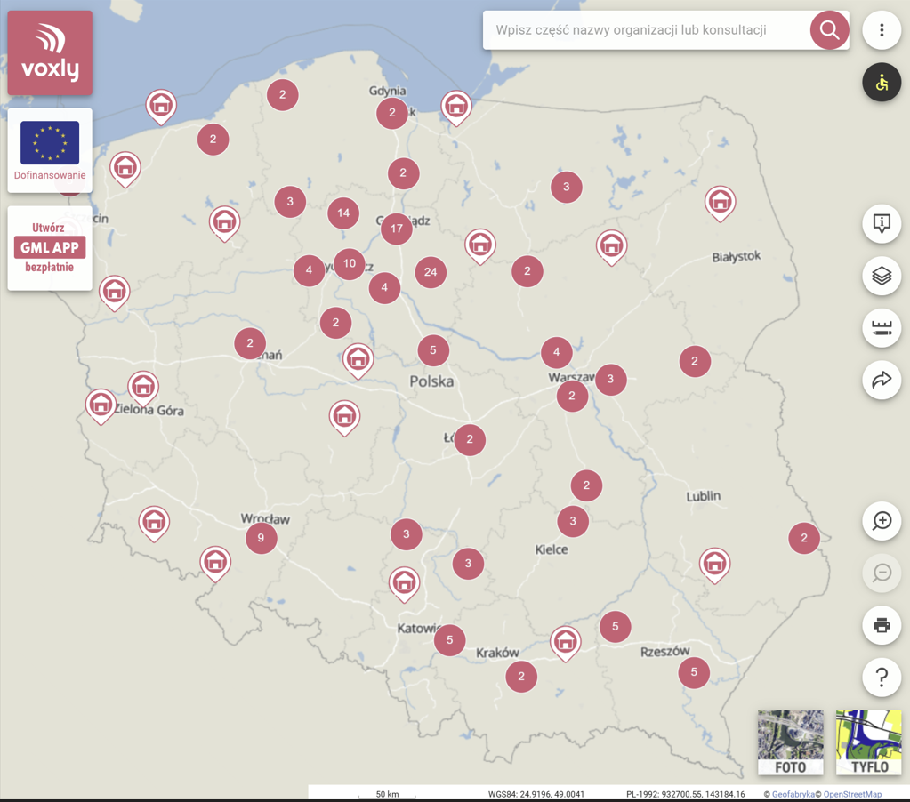 Po uruchomieniu Voxly możesz wyszukiwać organizacje, konsultacje, działki i adresy. Wyszukiwarkę znajdziesz centralnej części panelu powitania lub w oknie mapy.