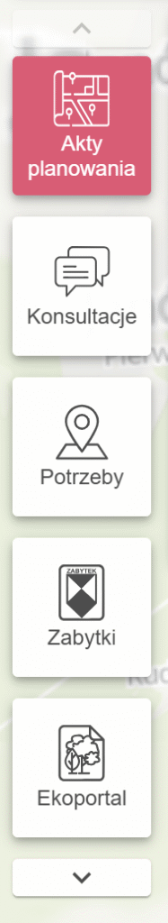 Mapa wyświetla informacje z różnych grup tematycznych. Tematy, które udostępnia organizacja np. Konsultacje czy Akty planowania, dostępne są pod odpowiednimi kafelkami. Wskaż kafelek, aby wybrać interesujący Cię temat.